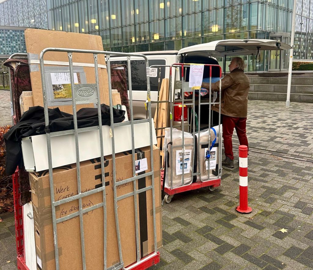 Op deze foto zie je hoe de expositie wordt gewisseld van de Christelijke Hogeschool Ede naar De Open Hof in Oud Beijerland. Er is een vast team dat de meeste vervoer en inrichting verzorgt, soms afgewisseld met andere leden om de wisseling op zich te nemen. Het is steeds flink aanpakken, soms lange stukken rijden en op elke locatie kijken hoe alles het beste kan hangen en staan. Behalve het fysieke werk is er ook de organisatie achter de schermen. We zijn dan ook enorm dankbaar voor iedereen die hierbij betrokken is.